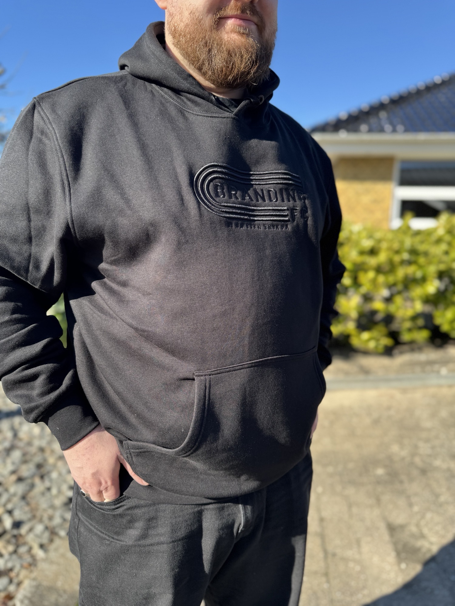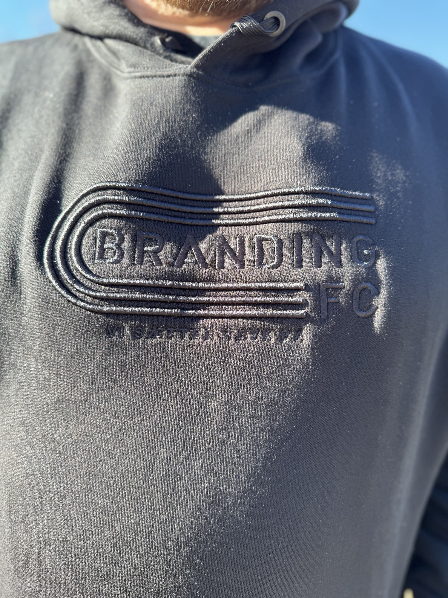 Vi kan også broderer dit logo, her set du et eksempel på et kvalitets broderi med 17845 sting på et 20 cm bredt logo med “puff” detajle.