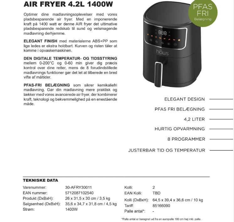 PFAS-FRI BELÆGNING som sikrer kemikaliefrimadlavning. Gør din madlavning mere praktisk og lækker med vores avancerede air fryer, der kombinerer kraft, teknologi og bekvemmelighed på en enestående måde.