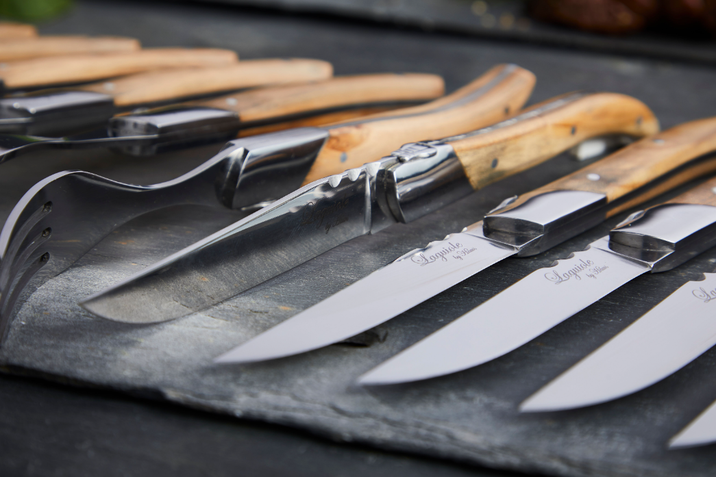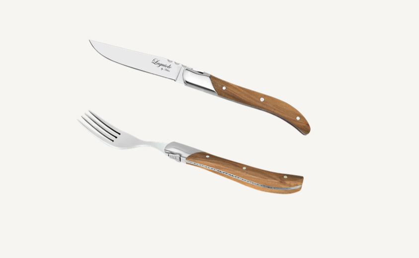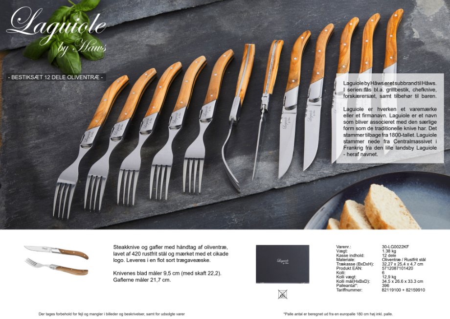 Steakknive – og gafler er med håndtag af oliventræ og blad lavet af 420 rustfrit stål. Begge er mærket på toppen med et cikade logo. Knivene og gaflerne kommer sammenpakket. Der er 6 stk. af hver i kassen og de leveres i en flot sort træ gaveæske.