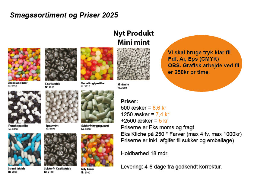 Æskerne er fyldt med lækre pastiller i forskellige smagsvarianter og kan tilpasses med dit logo, farver og design. Dette gør dem ikke bare til et produkt, men til en brandingoplevelse, der skaber genkendelighed hos dine kunder og samarbejdspartnere.