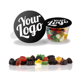 Vingummi, lakrids, dragé, konfekt og skum – det bedste fra Haribo. En sikker vinder hos både børn og voksne. Dit design trykkes i et dækkende farvetryk på låget.